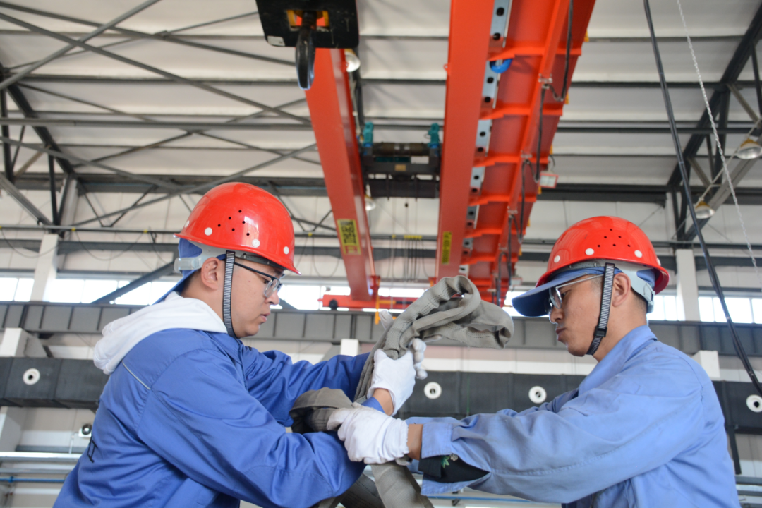 紅峽公司某車間工房內,兩名職工熟練地用吊繩對產品進行捆綁,粗糲的吊繩在兩人手中靈活傳遞,幾個回合下來,產品被穩穩地固定住,為下一道工序做好鋪墊。