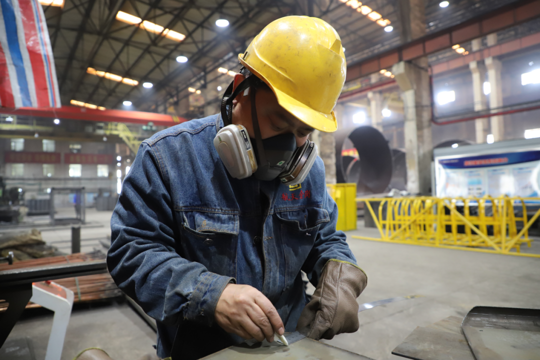 金崗重工新能源裝備制造中心冷作工組職工嚴格按照操作流程與圖紙尺寸,對鋼板進行測量、劃線與折彎,力求保質保量圓滿交付生產任務。
