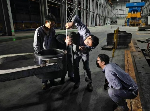 車間內,叉車的轟鳴奏響了奮斗的旋律。一位叉車司機熟練地操作設備,將鍛件穩(wěn)穩(wěn)抓起。4 名技術、生產(chǎn)骨干迅速圍攏過來,手中的卷尺成為他們攻克技術難題的有力“武器”。他們專注地測量每一處尺寸,目光在鍛件與測量數(shù)據(jù)間來回切換,不放過任何一個細節(jié)。