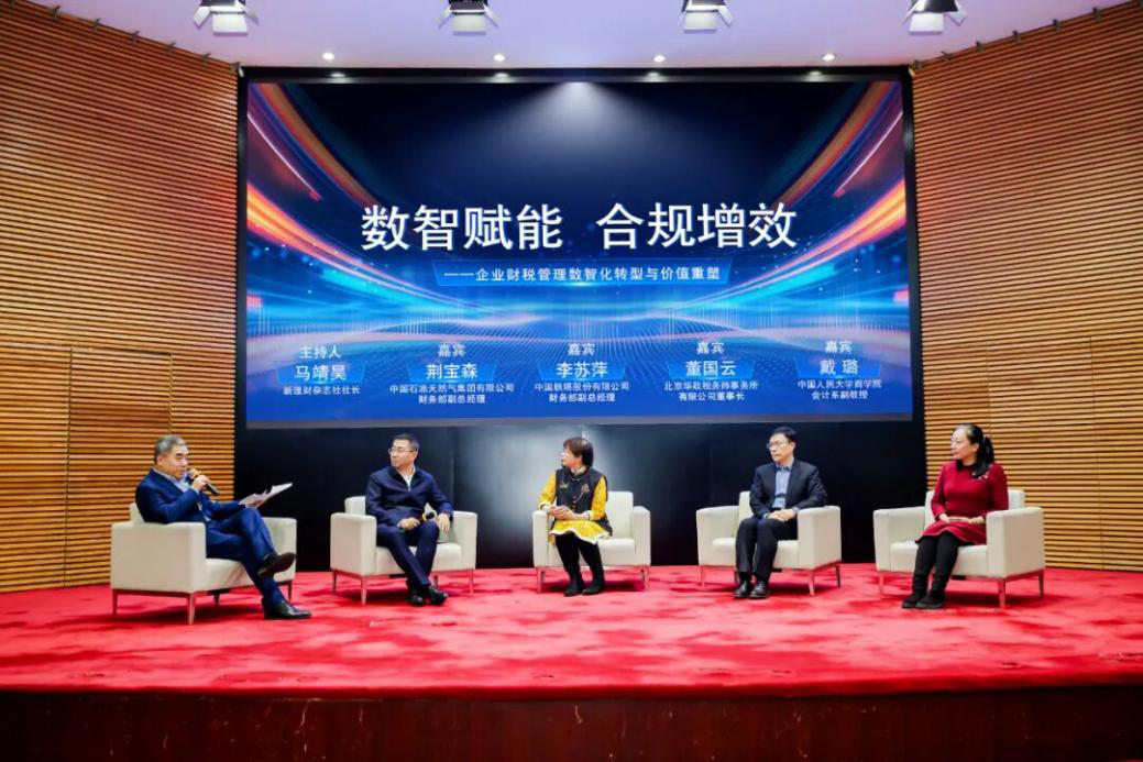 圓桌討論由馬靖昊主持,中國石油天然氣集團有限公司財務部副總經理荊寶森、中國鐵塔股份有限公司財務部副總經理李蘇萍、北京華政稅務師事務所有限公司董事長董國云、中國人民大學副教授戴璐等嘉賓結合自身實踐經驗與研究洞察,圍繞“數智賦能?合規增效——企業財稅管理數智化轉型與價值重塑”議題展開熱烈交流,分享了在政策把握、技術應用、團隊建設等方面的寶貴經驗。