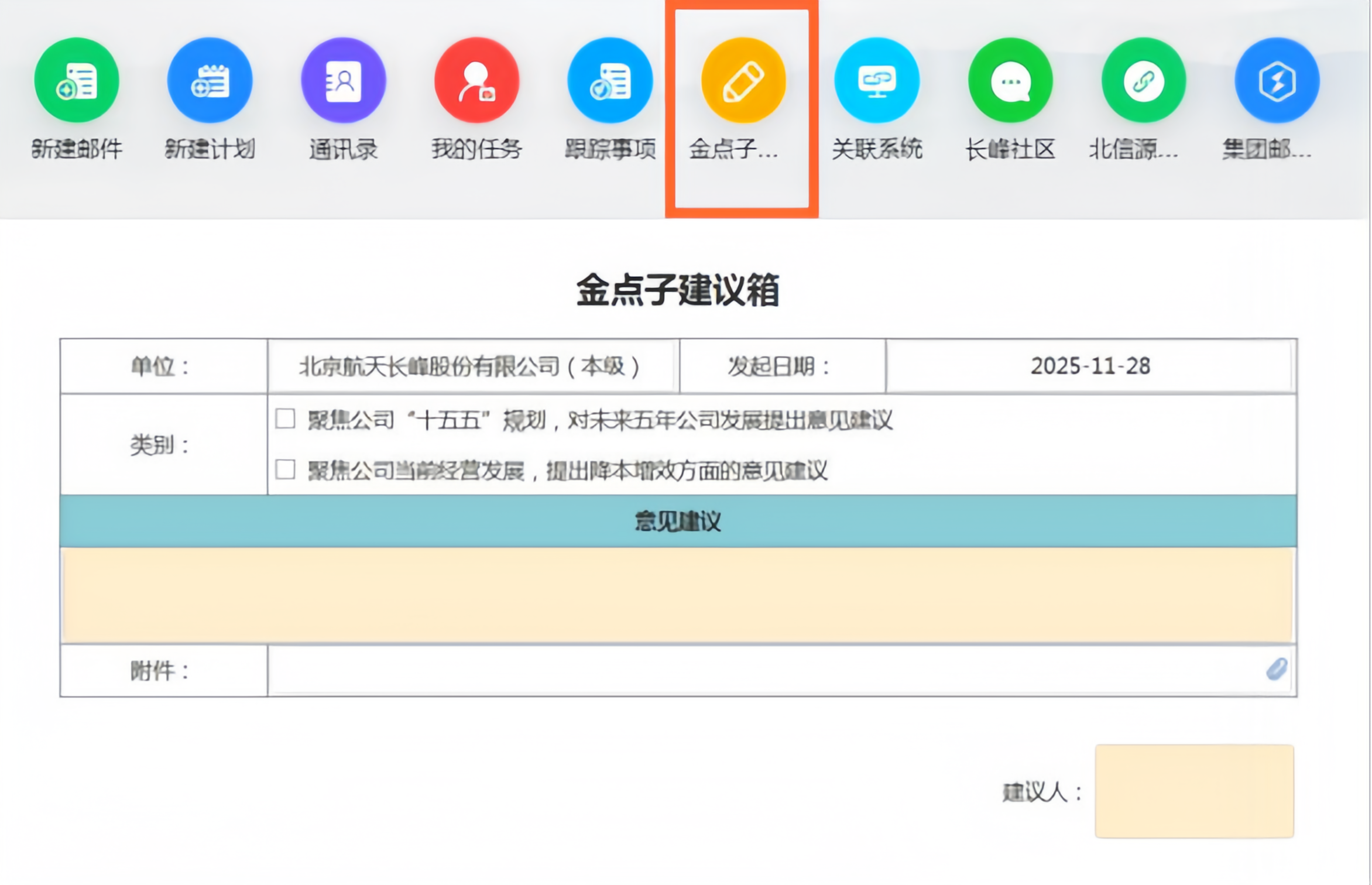 同心奮戰(zhàn)破難關的道路上,離不開集體智慧。啟航“十五五”新征程之際,公司面向全體職工開展“我為‘十五五’獻一策”意見建議征集活動,集思廣益、凝智聚力更好完善“十五五”發(fā)展目標、任務和措施。目前,已在OA辦公平臺設立“金點子建議箱”,全面收集、整理、研究各方面提出的意見建議。